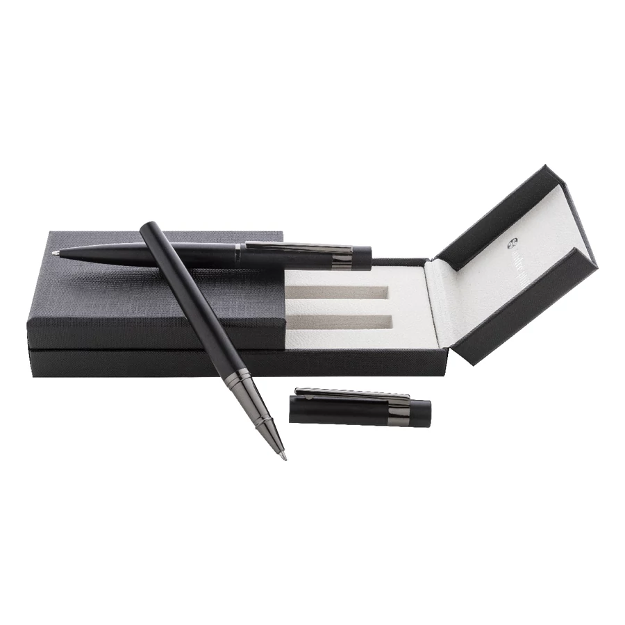Elegáns, fém golyóstoll és rollertoll szett fényes fegyverfém részletekkel. Színben hozzáillő ajándékdobozban, kék tollbetéttel. André Philippe márkatermék.