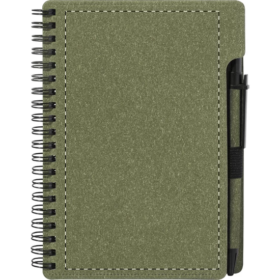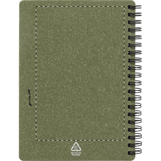 Újrahasznosított papír spirál jegyzetfüzet 80 vonalas lappal. A6 méretű. Tartalmaz egy újrahasznosított papír és újrahasznosított PP anyagú golyóstollat kék tollbetéttel.