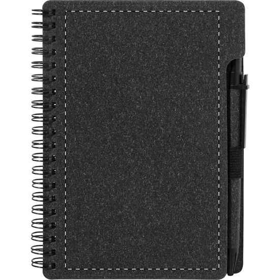 Újrahasznosított papír spirál jegyzetfüzet 80 vonalas lappal. A6 méretű. Tartalmaz egy újrahasznosított papír és újrahasznosított PP anyagú golyóstollat kék tollbetéttel.