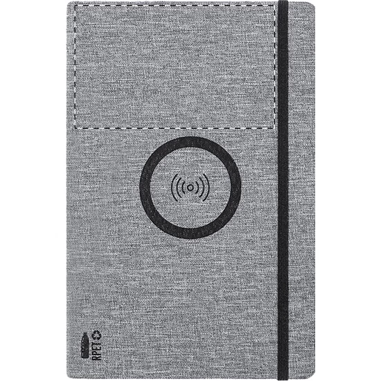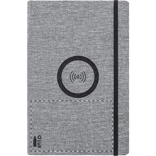 | RPET poliészter vezeték nélküli töltős jegyzetfüzet (10W) 80 vonalas lappal, A5. USB töltőkábellel együtt szállítjuk. 300D RPET poliészter. | |