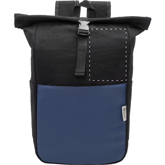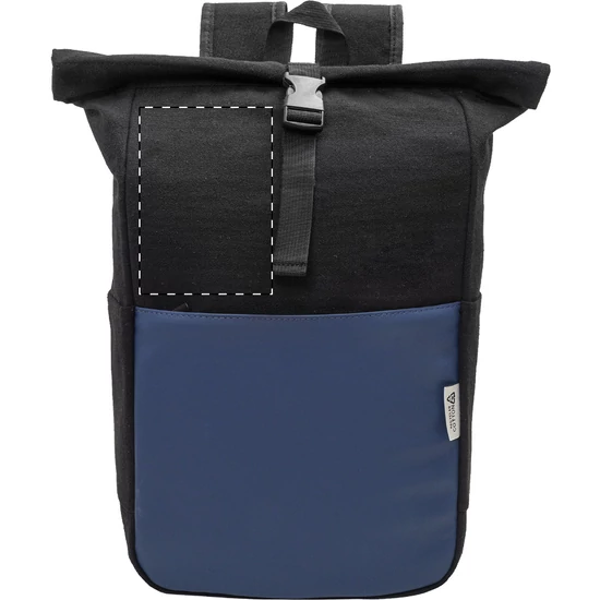 Újrahasznosított vászonból készült rolltop hátizsák csattal és cipzáras elülső zsebbel, puha, újrahasznosított PU bőrből. Párnázott laptop rekesszel (15"), oldalsó zsebekkel, párnázott hátrésszel és vállpántokkal. 70% újrahasznosított pamut és 30% RPET poliészter. Megkülönböztető újrahasznosított pamut címkével.