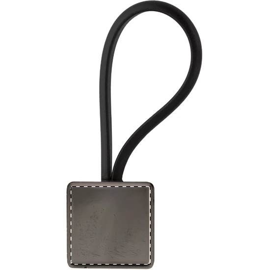 Négyszög alakú fém kulcstartó fekete gumi hurokkal és jól epoxy matricázható felülettel.