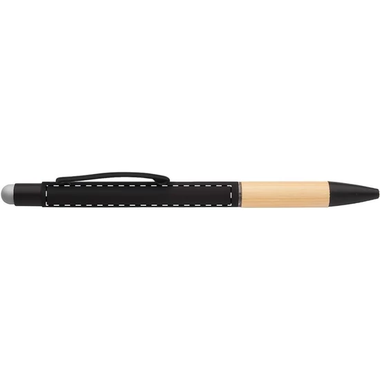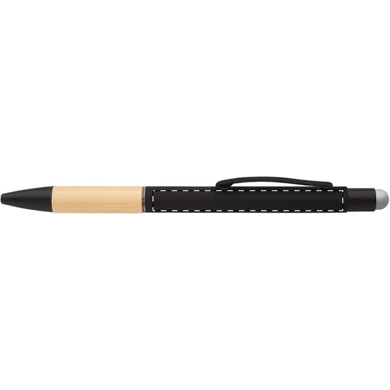 Alumínium, érintőképernyős golyóstoll bambusz markolattal és gumírozott felülettel. Különleges bevonattal, melynek gravírozása után az embléma az érintőképernyős véggel harmonizáló színben jelenik meg. Kék tollbetéttel szállítjuk.