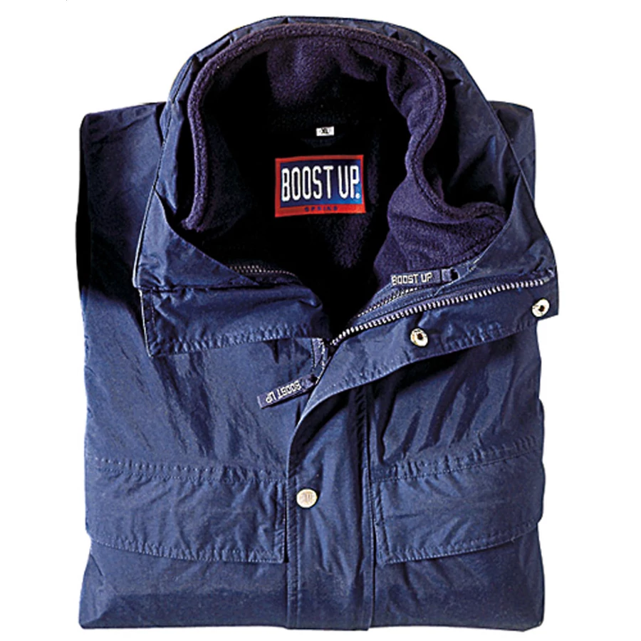 | 3 in 1: dzseki, átmeneti dzseki és pulóver, szél-és vízálló. Bélése cipzárral rögzített, gallérjába hajtható kapucni. | |
