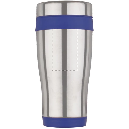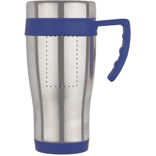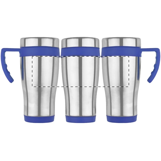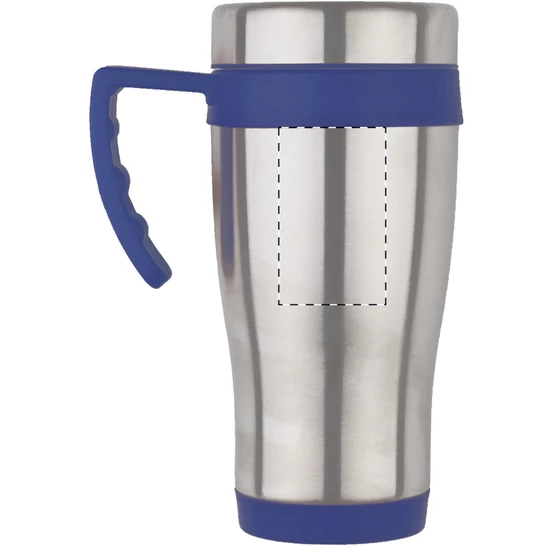Rozsdamentes acélból készült, duplafalú thermo bögre, színes műanyag részekkel és fogantyúval, dobozban szállítjuk. 450 ml.