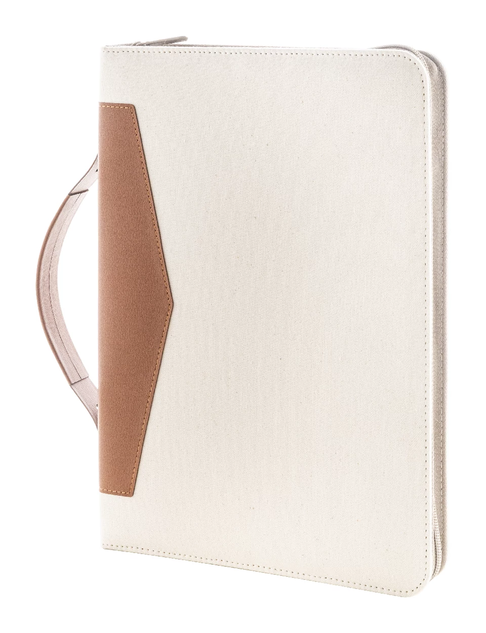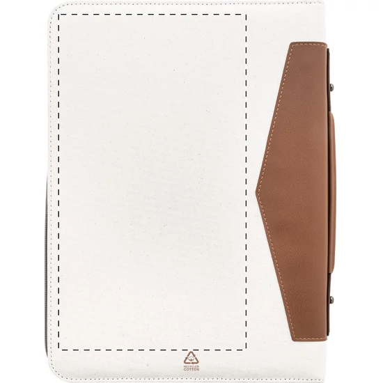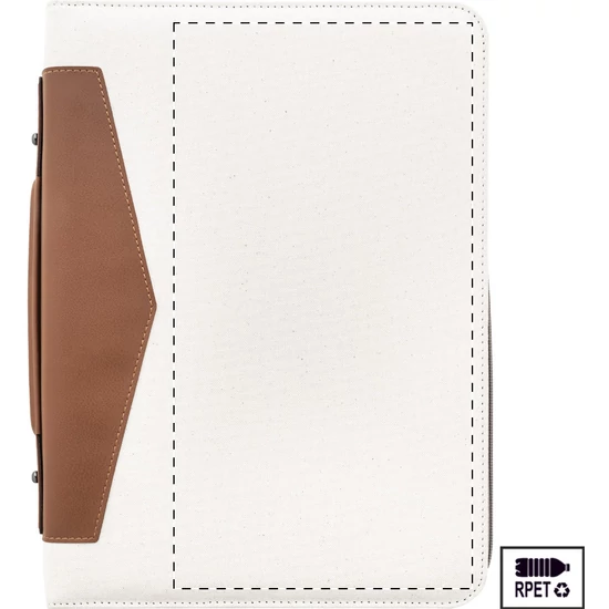 A4-es méretű, újrahasznosított vászon és újrahasznosított PU bőr, cipzáras iratmappa hordfüllel és belső rendező zsebekkel. 20 vonalas jegyzettömbbel újrahasznosított papírból. 70% újrahasznosított pamut és 30% RPET poliészter.