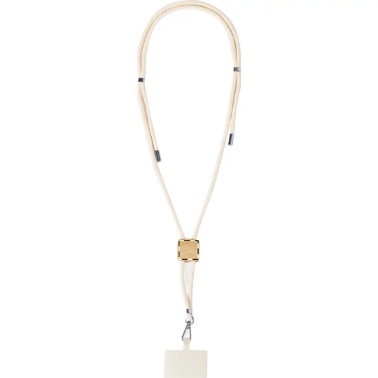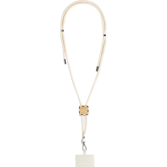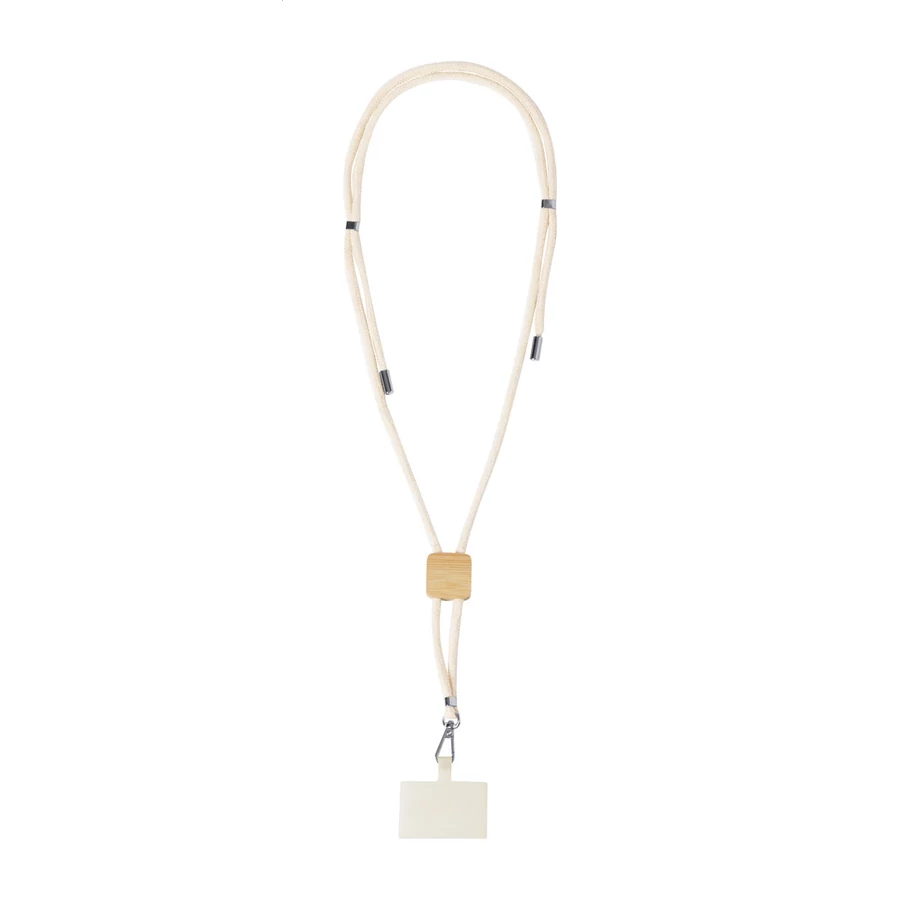 | Állítható hosszúságú, pamut mobiltartós nyakpánt bambusz címkével, telefontartó betéttel és fém karabinerrel. | |