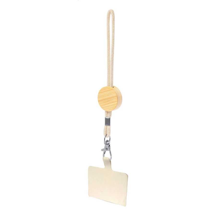 | Pamut mobiltartós karkötő kerek bambusz címkével, telefonbetéttel és fém karabinerrel. | |