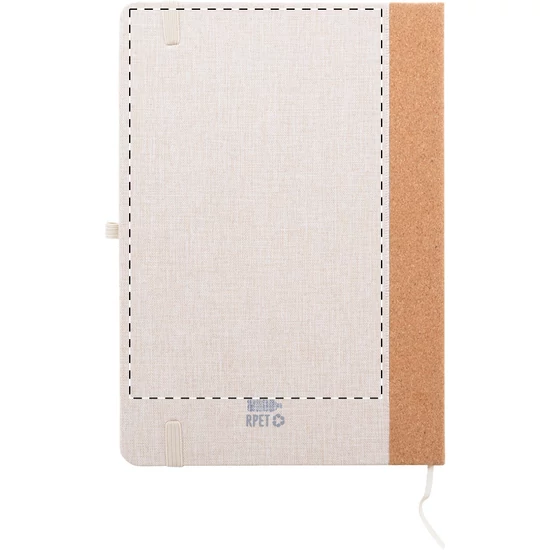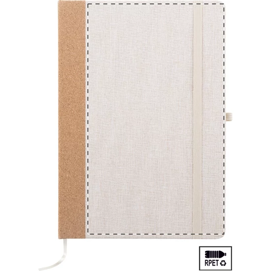 | RPET poliészter borítású jegyzetfüzet natúr parafa gerinccel és 80 vonalas lappal, újrahasznosított papírból. Könyvjelzővel, gumipánttal és tolltartóval. A5 méretű. | |