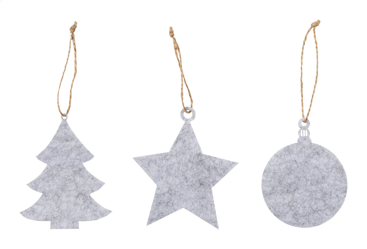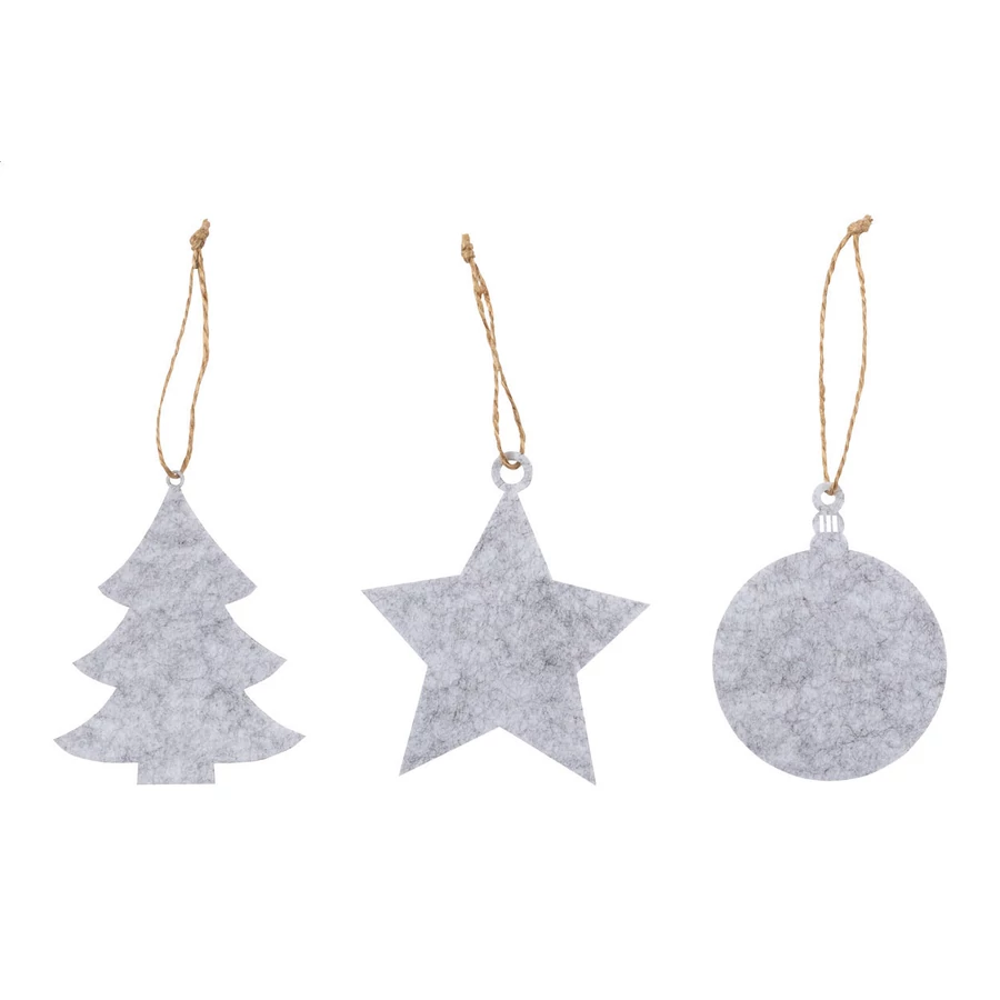 3 db-os filc karácsonyfadísz szett juta zsinórral. Gömb, csillag és karácsonyfa formájú díszeket tartalmaz.