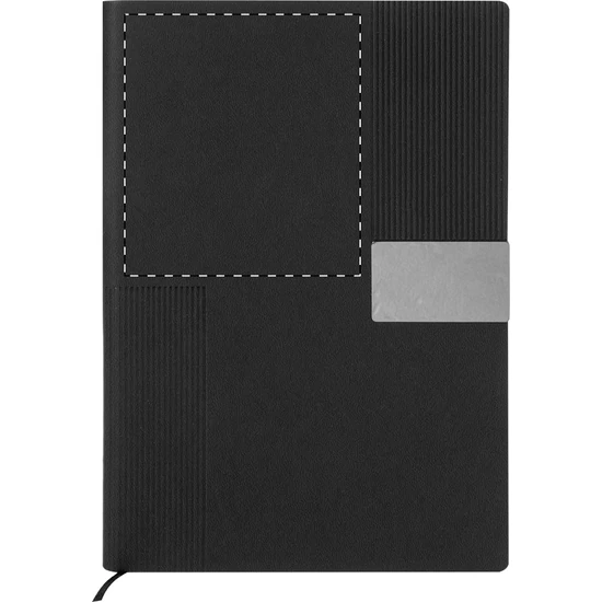 Újrahasznosított műbőr borítású jegyzetfüzet csíkos díszítéssel és fém logózható résszel. Könyvjelzővel és 80 vonalas lappal újrahasznosított papírból. A5-ös méret.