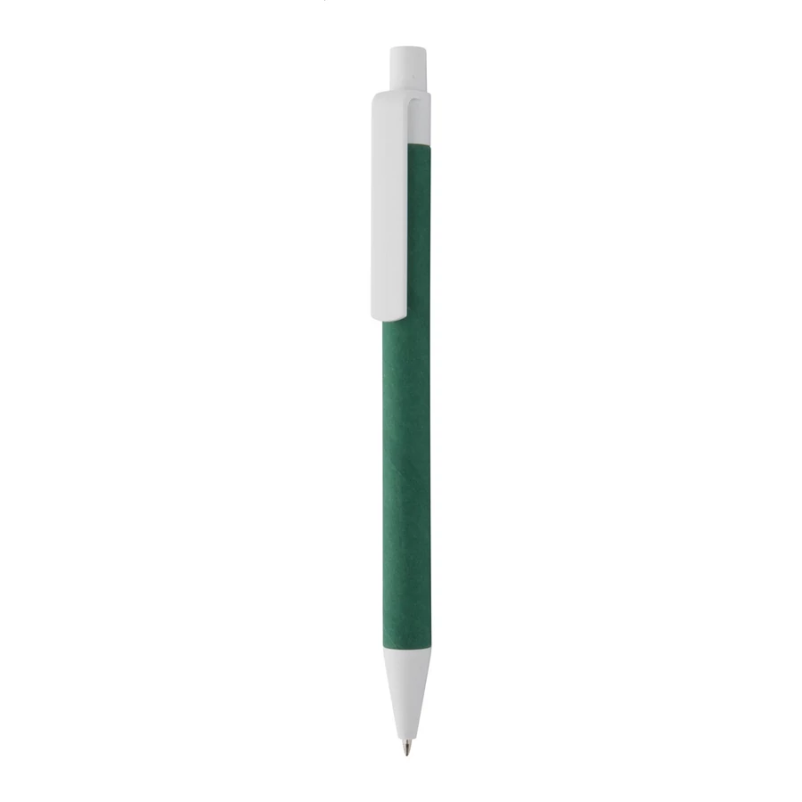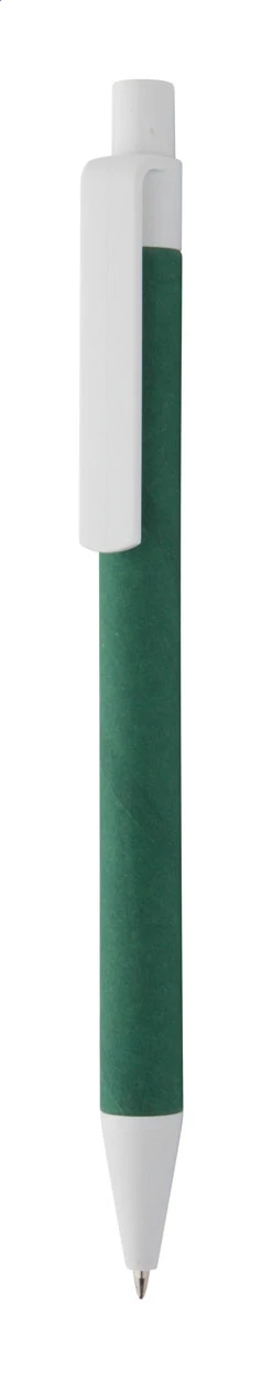 Újrahasznosított kartonpapírból és fehér műanyagból készült golyóstoll. Kék tollbetéttel szállítjuk.