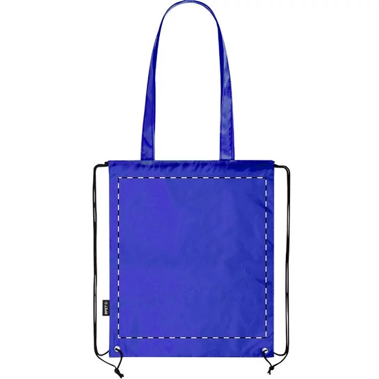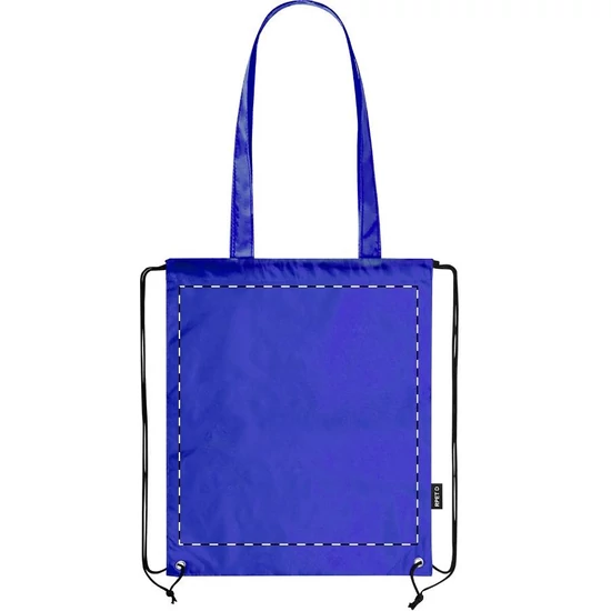 RPET poliészter összehúzható hátizsák és bevásárlótáska hosszú hordfüllel. Megkülönböztető RPET címkével.