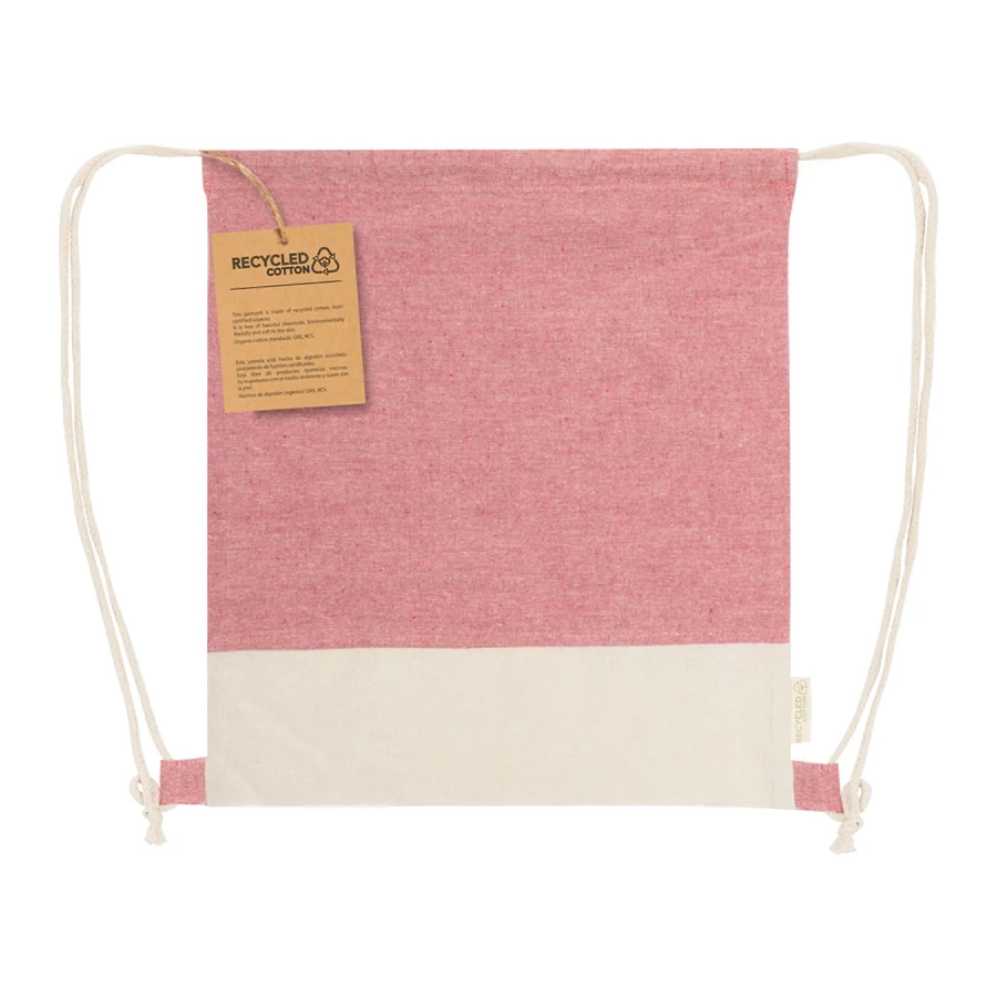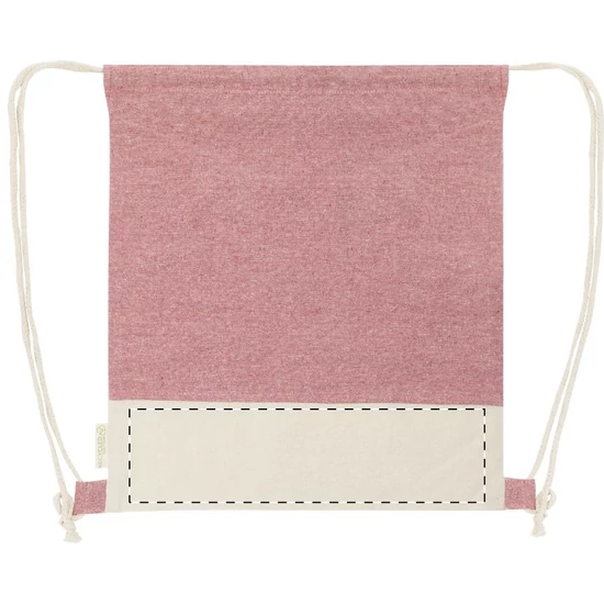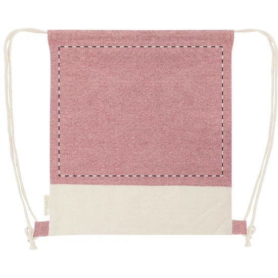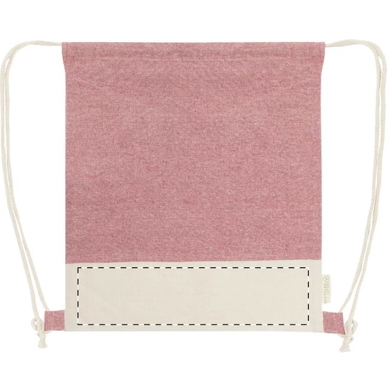| Kéttónusú, újrahasznosított pamut összehúzható hátizsák megkülönböztető újrahasznosított pamut címkével. 100% újrahasznosított pamut, 120 g/m². | |
