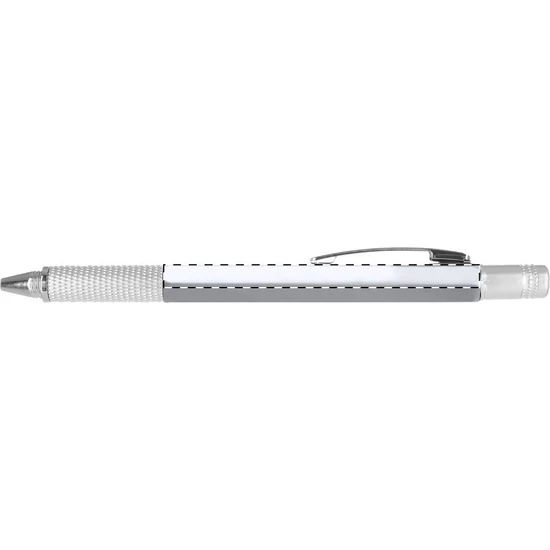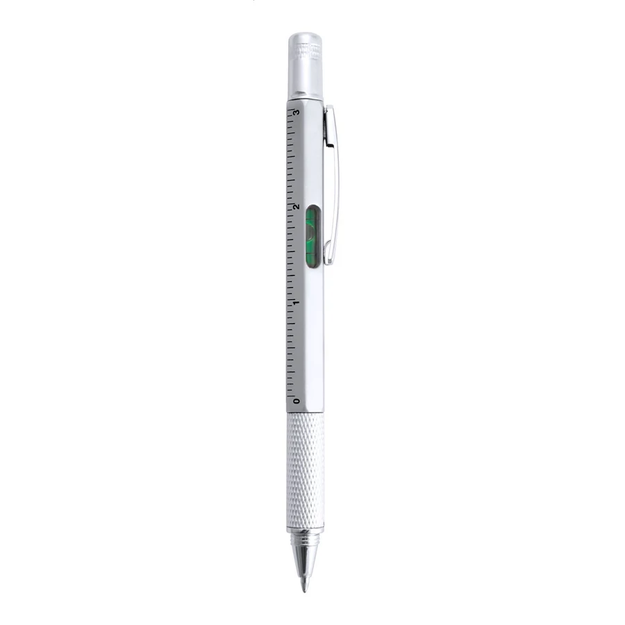 Műanyag golyóstoll fém klipsszel, csillag és laposfejű csavarhúzóval, vízmértékkel és 7 cm-es vonalzóval. Kék tollbetéttel szállítjuk.
