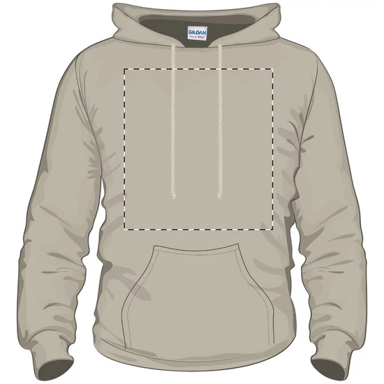 80% pamut és 20% poliészter anyagú, kapucnis pulóver elülső zsebbel. 285 g/m² (fehér 278 g/m²). Gildan márkatermék.