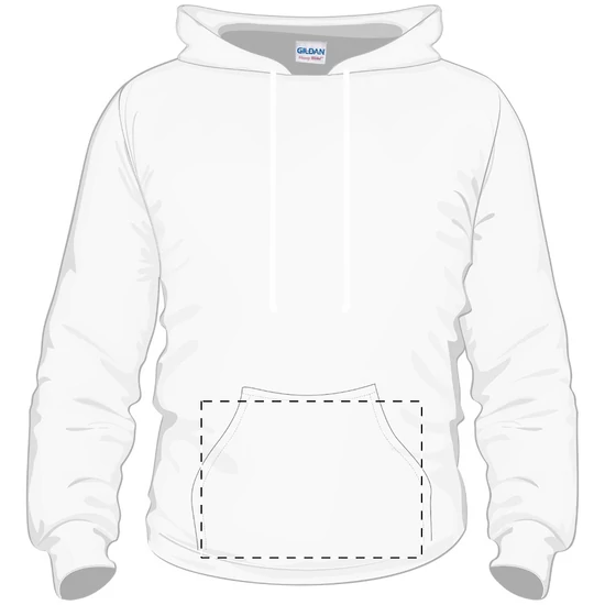 80% pamut és 20% poliészter anyagú, kapucnis pulóver elülső zsebbel. 285 g/m² (fehér 278 g/m²). Gildan márkatermék.