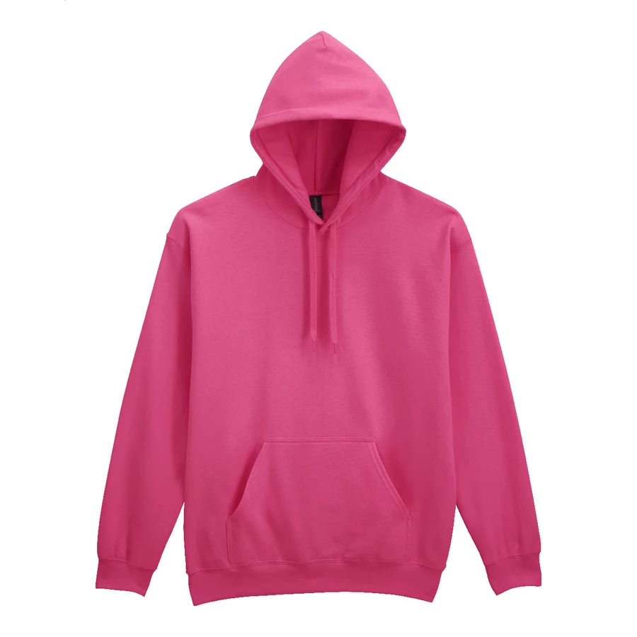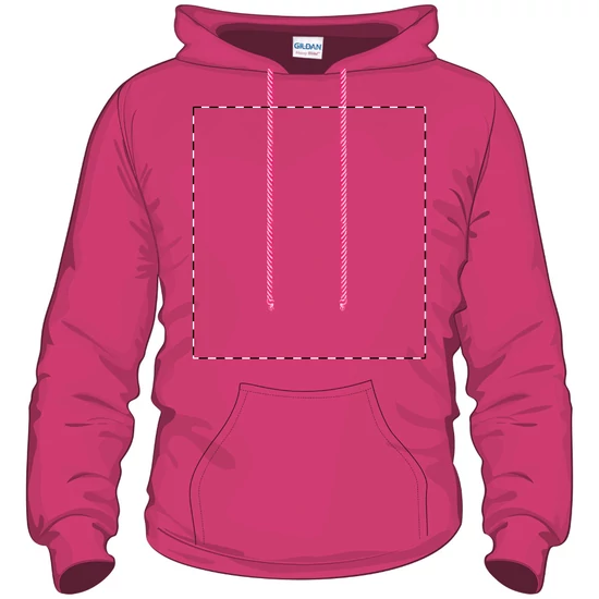 80% pamut és 20% poliészter anyagú, kapucnis pulóver elülső zsebbel. 285 g/m² (fehér 278 g/m²). Gildan márkatermék.