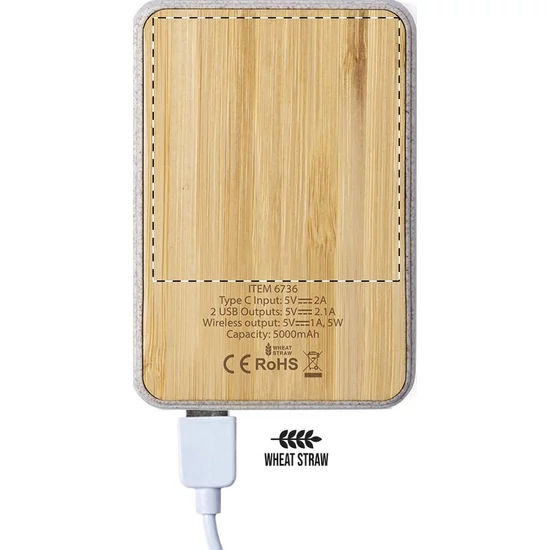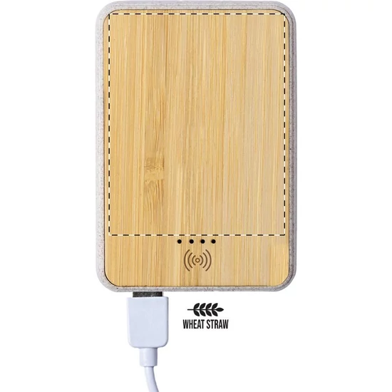| Bambusz és búzaszalma műanyag borítású USB power bank 5000 mAh kapacitású akkumulátorral és beépített vezeték nélküli töltővel (5W). 2 USB töltő porttal. USB-C bemeneti porttal. USB töltőkábellel szállítjuk. | |