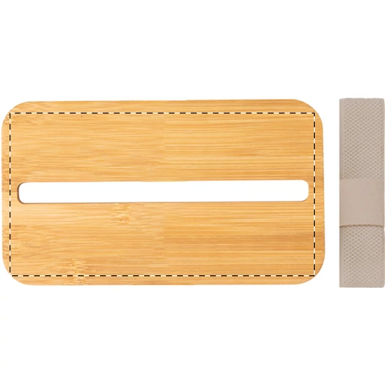 PP műanyag uzsonnás doboz evőeszköz készlettel (villa, kanál és kés), bambusz fedéllel, mobiltelefon tartó funkcióval és rugalmas pánttal. 2 darab 700 ml kapacitású rekesszel ellátva.