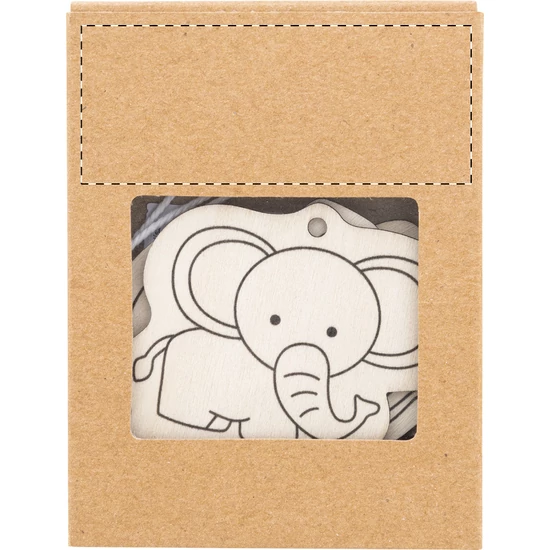 3 darabos fa állatfigurás színező szett, 4 db fa színes ceruzával és akasztózsinórral. Kraft papír dobozban.