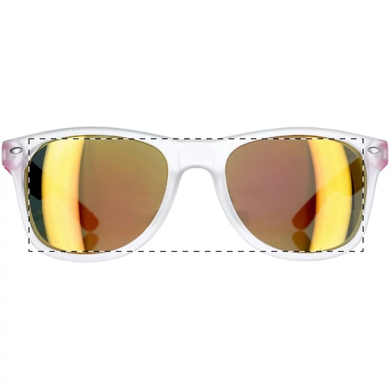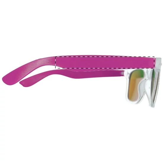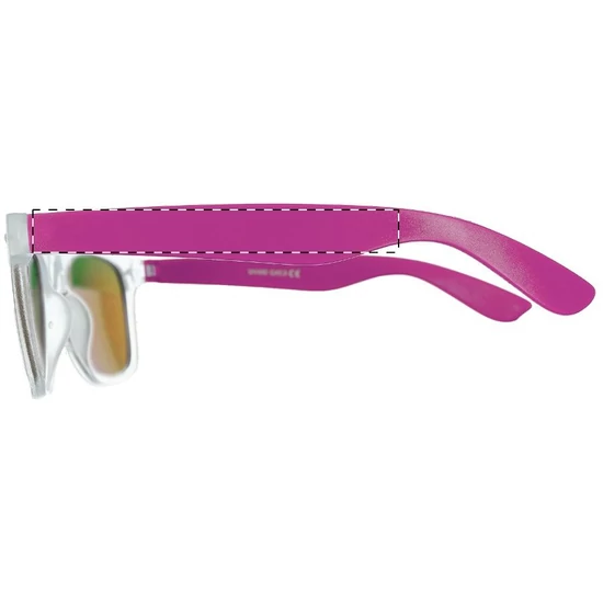 | Műanyag, áttetsző keretű napszemüveg színes szárral és foncsorozott lencsékkel. UV 400 fényvédelemmel. | |