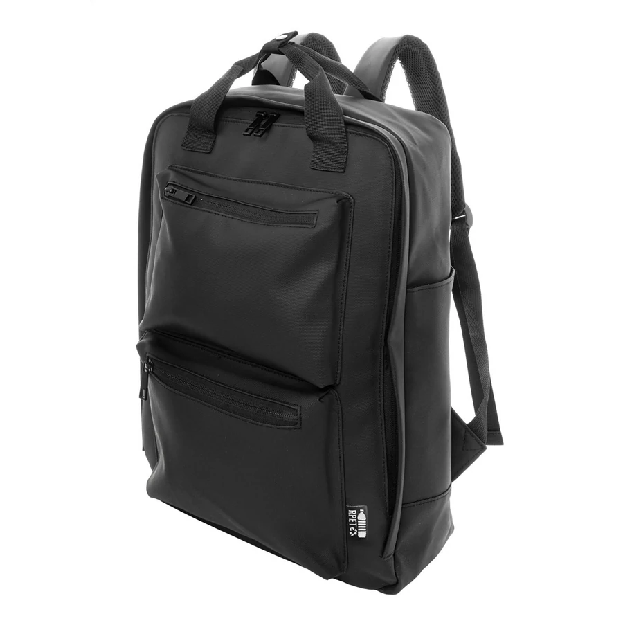 Vízálló, puha újrahasznosított PU bőr hátizsák cipzáras fő rekesszel, 2 cipzáras első zsebbel, oldalzsebekkel és párnázott laptop (15") és tablet (10") rekesszel. Párnázott hát- és vállpántokkal. Megkülönböztető újrahasznosított PU bőr címkével.