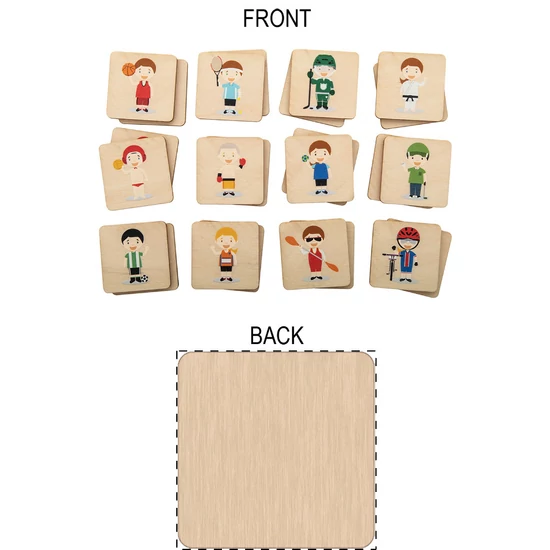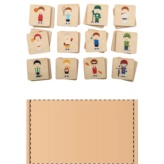 Rétegelt nyírfából készült memóriajáték tematikus figurákkal. 24 lapka (40×40 mm). Az ár tartalmazza az emblémázás költségét, 1 színnel nyomva az összes lapka hátoldalán. Minimális rendelési mennyiség: 50 db.