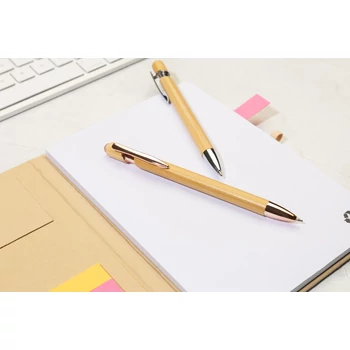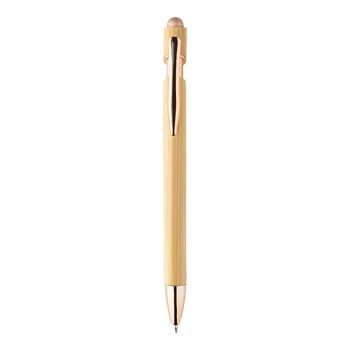 | Bambusz érintőképernyős golyóstoll fényes fém részletekkel, hozzá illő színű érintőceruzával. Kék tollbetéttel. | |