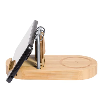 | Bambusz, többfunkciós vezeték nélküli gyorstöltő (15W) mobiltartóval és öröknaptárral, fémvázon. USB és USB-C töltő csatlakozókkal. 50 kraft papír öntapadós lapot és USB töltőkábelt tartalmaz. | |
