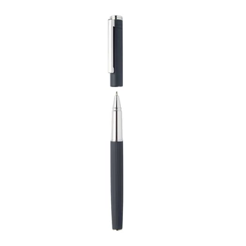 Elegáns, alumínium golyóstoll és rollertoll szett, csíkozott felülettel. Fekete díszdobozban, kék tollbetéttel szállítjuk.