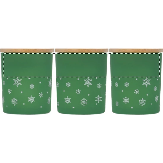 Növényi alapú illatosított viaszgyertya homokfúvott üveg tartóban, karácsonyi hópehely díszítéssel és bambusz fedéllel. 120 gramm viasszal. Kraft papír dobozban.