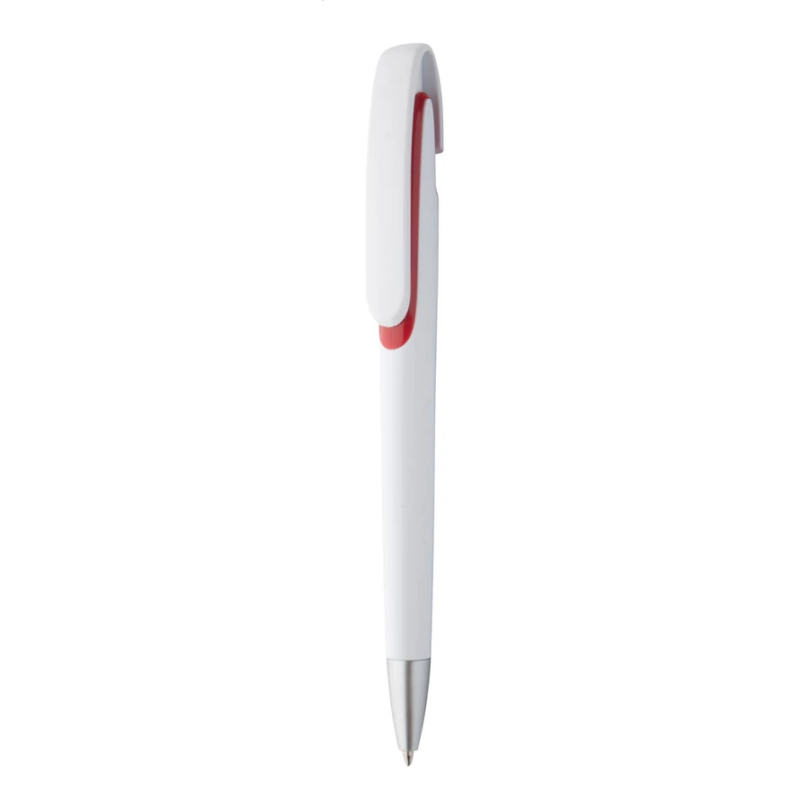 Fehér testű, műanyag golyóstoll, ezüst hatású tollvéggel. A klipsz alatt színes betét található. Kék tollbetéttel szállítjuk.