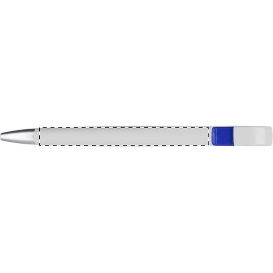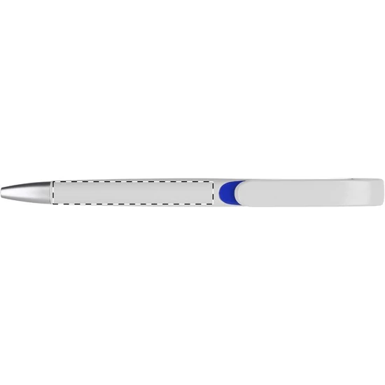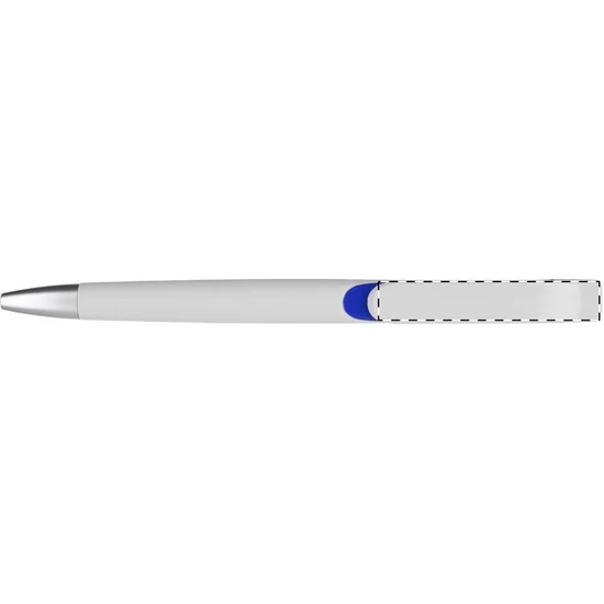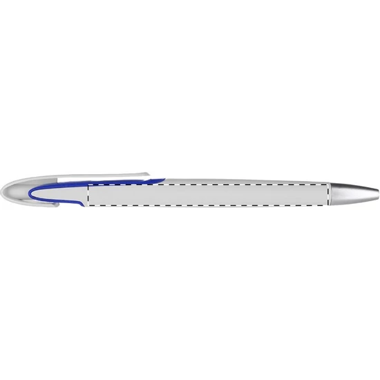 Fehér testű, műanyag golyóstoll, ezüst hatású tollvéggel. A klipsz alatt színes betét található. Kék tollbetéttel szállítjuk.
