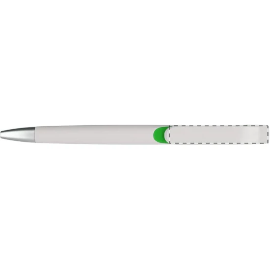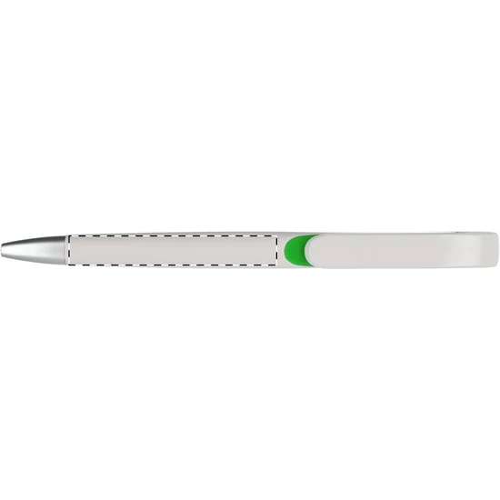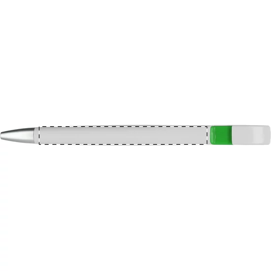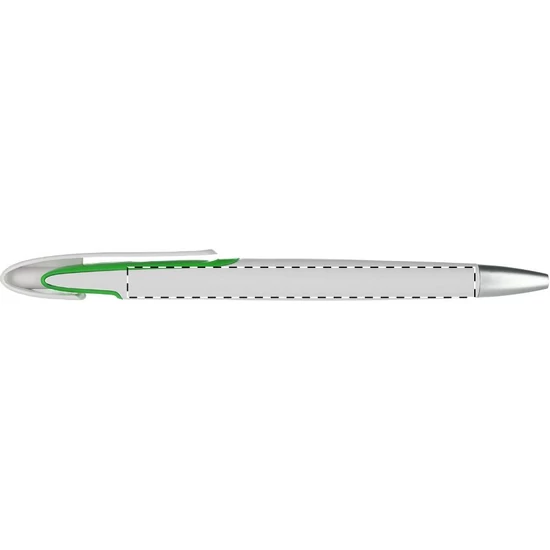 Fehér testű, műanyag golyóstoll, ezüst hatású tollvéggel. A klipsz alatt színes betét található. Kék tollbetéttel szállítjuk.