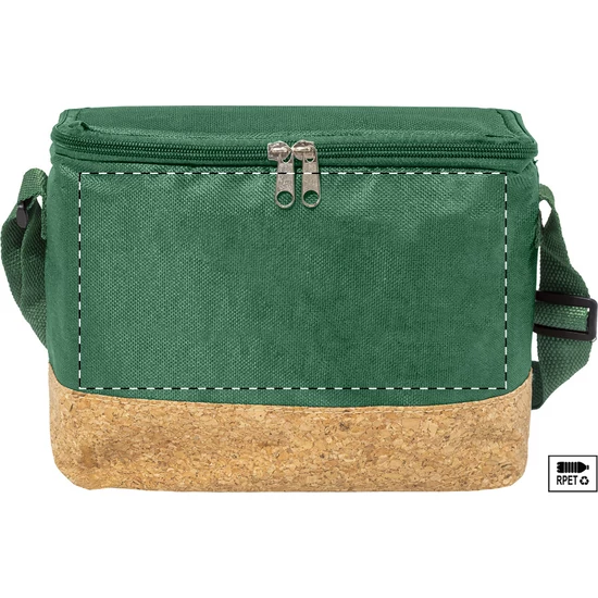 | 600D RPET poliészterből készült, cipzáras hűtőtáska természetes parafa talppal, PEVA béléssel és állítható vállpánttal. Megkülönböztető RPET címkével. | |