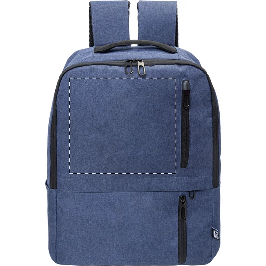 RPET hátizsák cipzáras fő rekesszel és 3 cipzáras elülső zsebbel. Párnázott tablet- (10") és laptop rekeszekkel (15"), párnázott hátrésszel és vállpántokkal. 600D RPET poliészter, megkülönböztető RPET címkével.