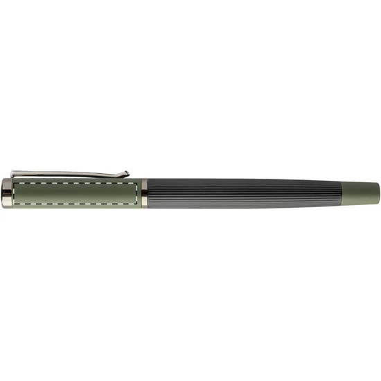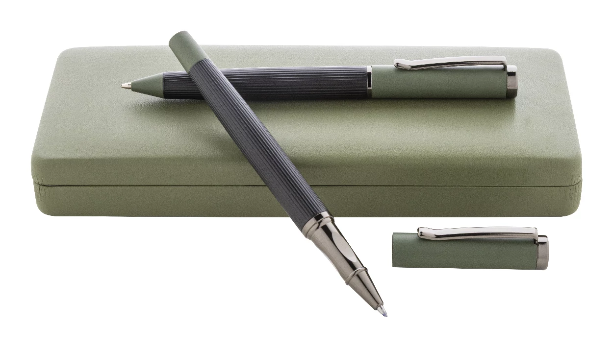 Elegáns, fém golyóstoll és rollertoll szett csíkos testtel, színes díszítőelemekkel és fényes fegyverfém részletekkel. Színben hozzáillő ajándékdobozban, kék tollbetéttel. André Philippe márkatermék.