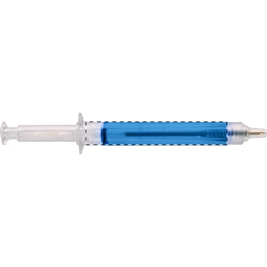Injekció formájú műanyag golyóstoll, folyadékkal töltött átlátszó testtel. Kék tollbetéttel szállítjuk.
