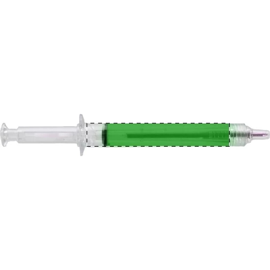 | Injekció formájú műanyag golyóstoll, folyadékkal töltött átlátszó testtel. Kék tollbetéttel szállítjuk. | |