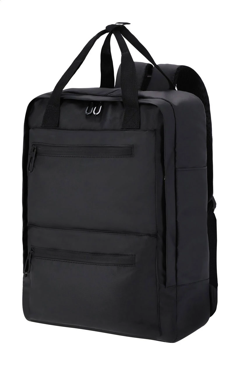 Puha PU bőr hátizsák cipzáras rekesszel és első zsebekkel, párnázott laptop (15") és tablet (10") rekesszel, párnázott hát- és vállpánttal.