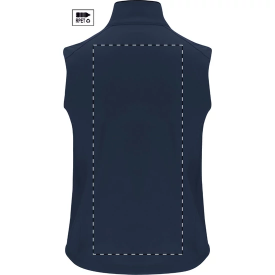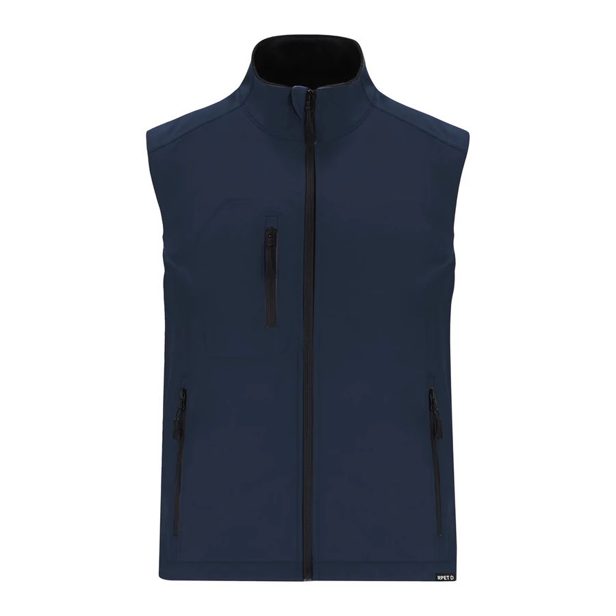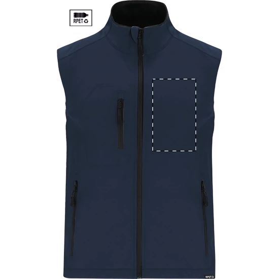 Háromrétegű, szél- és vízálló cipzáras RPET softshell mellény cipzáras mellkas és oldalzsebekkel. Kívül: 94% RPET poliészter és 6% elasztán. Belül: 100% RPET poliészter polár. 340 g/m².