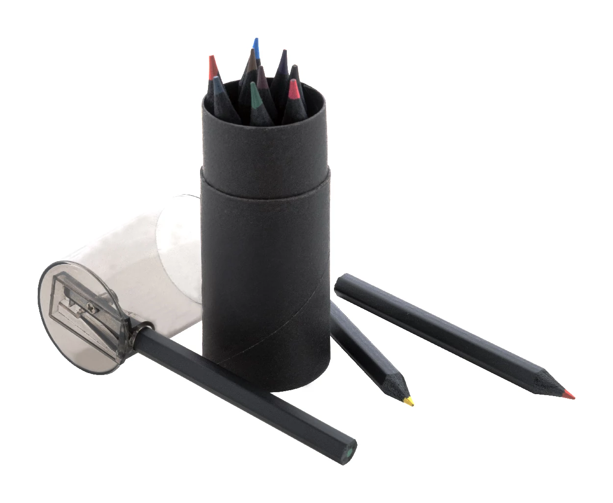 12 db-os fekete fa színű ceruzakészlet kerek fekete karton tokban, műanyag hegyezővel.