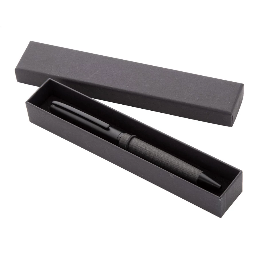 Elegáns, tekerős fém golyóstoll PU bőr borítással és fekete részletekkel. Fekete díszdobozban, kék tollbetéttel szállítjuk.