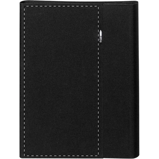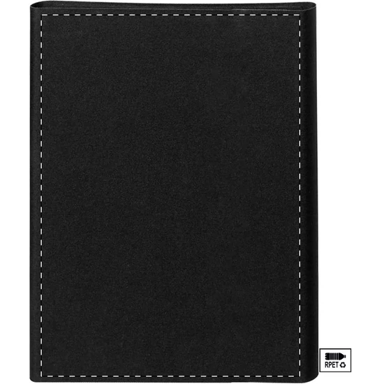 | A4 méretű, 600D RPET poliészterből készült iratmappa mágneses zárral, összehajtható mobiltelefon-tartóval és 20 vonalas lappal. Megkülönböztető RPET címkével ellátva. | |