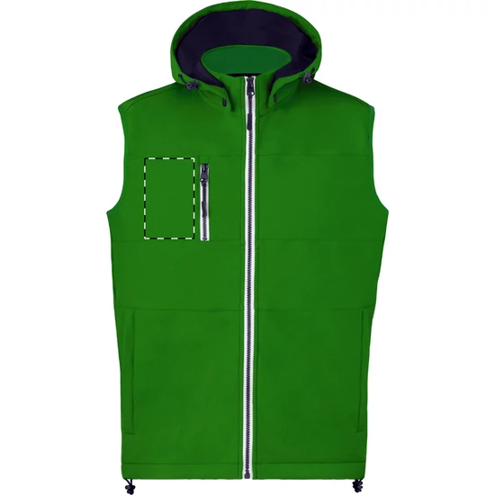 | Szél- és vízálló, cipzáras softshell mellény 2 oldalzsebbel, 1 első zsebbel, állógallérral és levehető kapucnival. 100% poliészter, 300 g/m². | |