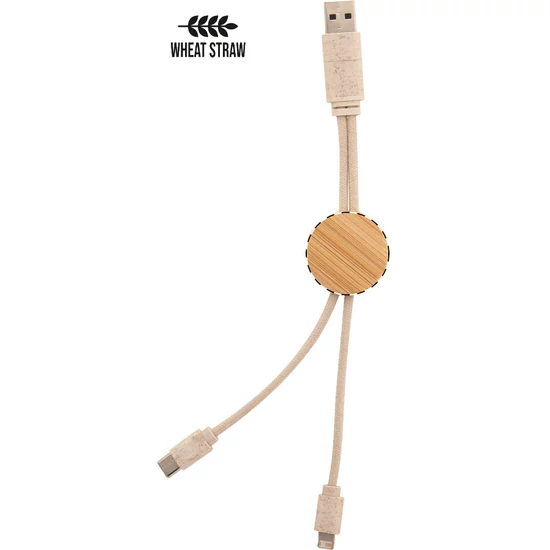 Ökológiai búzaszalma műanyag, pamut és bambusz USB töltőkábel micro USB, USB-C és Lightning csatlakozókkal. USB és USB-C bemenettel.