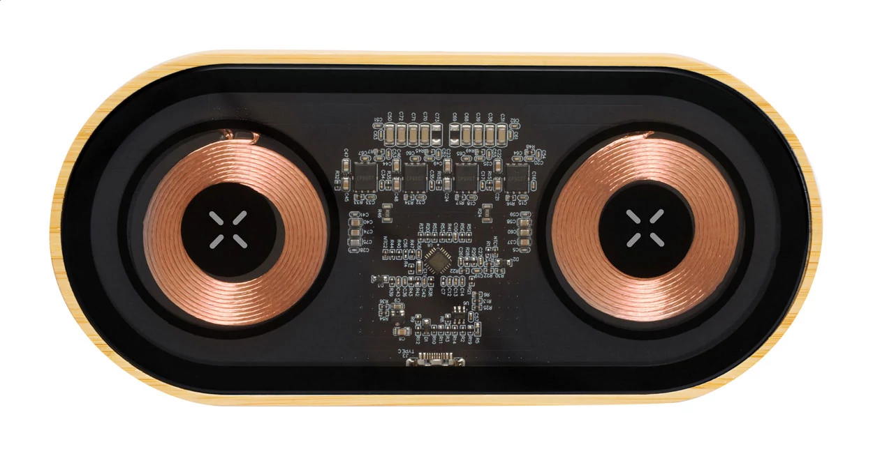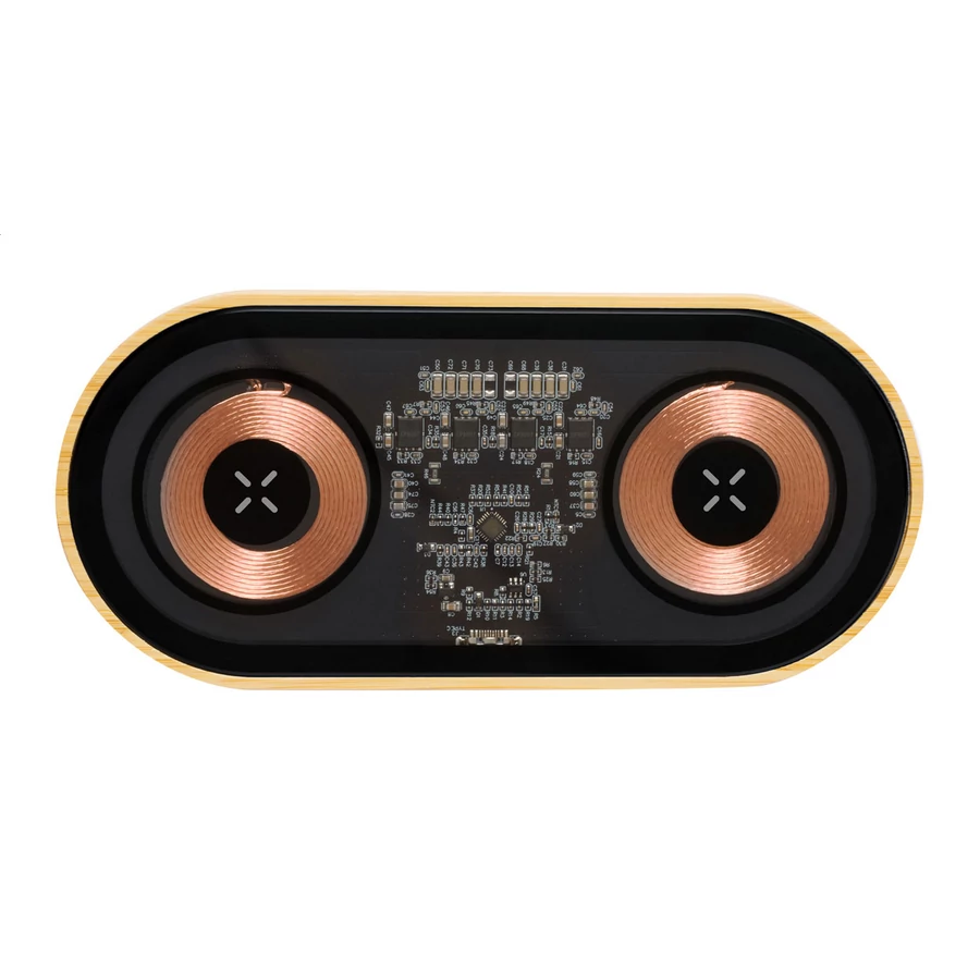 Kéttekercses vezeték nélküli gyorstöltő (15W) bambusz és átlátszó műanyag házban, látható elektronikus alkatrészekkel. USB töltőkábellel szállítjuk.