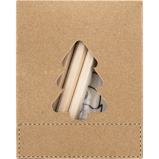| Színezhető karácsonyfadísz-szett kraft papír dobozban, kivágott karácsonyfával. 3 db kenderzsinóros fa díszt és 4 db színes ceruzát tartalmaz. | |