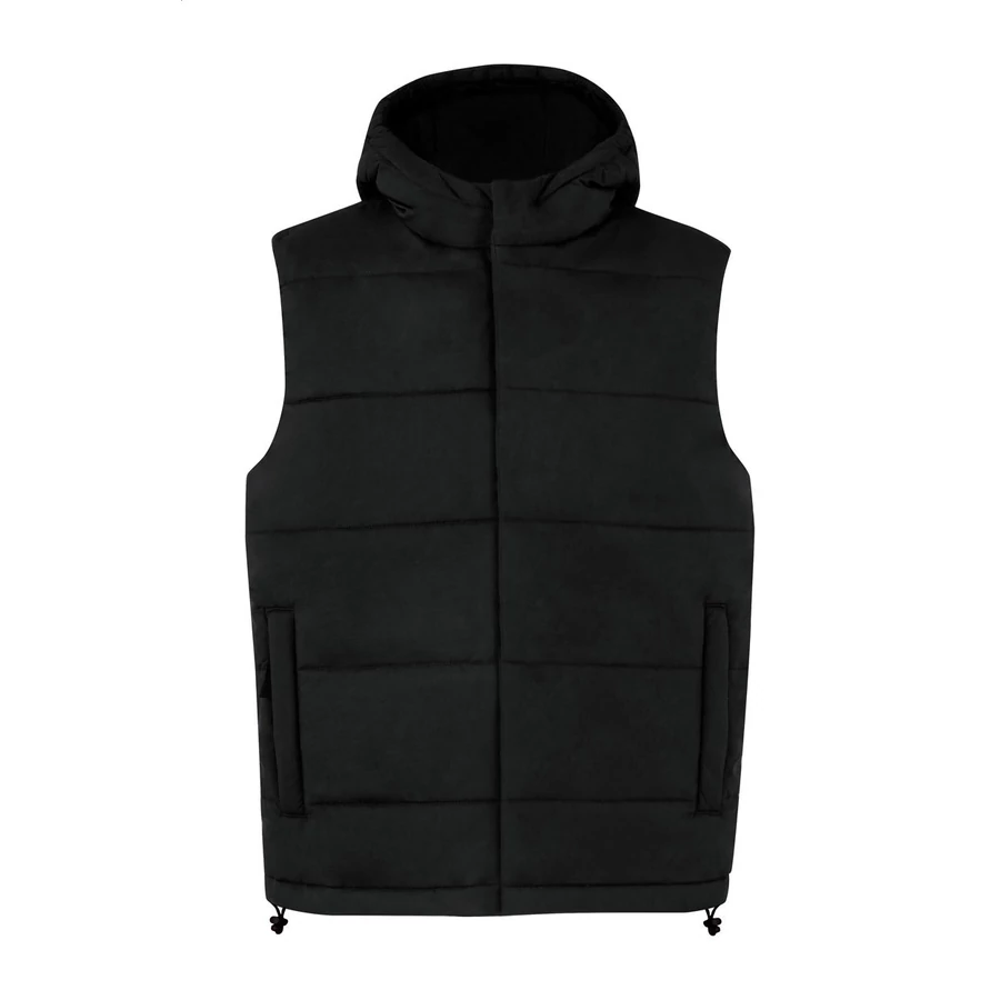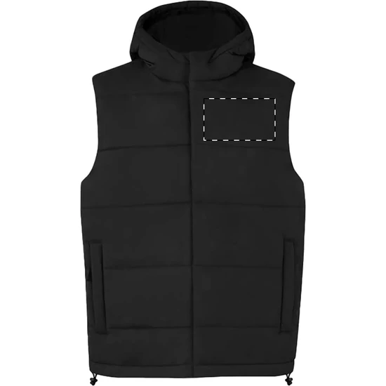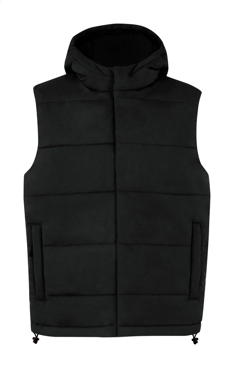 Szél- és vízálló, bélelt mellény dupla cipzárral és gombbal. Kapucnival és oldalzsebekkel. 100% poliészter.